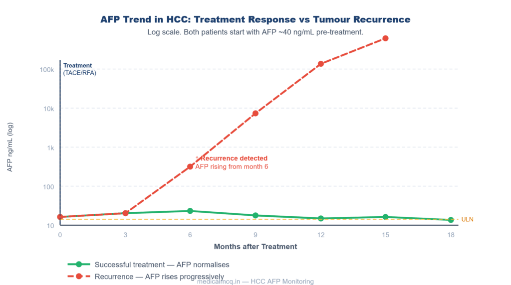 Fig 2. AFP monitoring after HCC treatment (TACE/RFA). Green = durable response (AFP stays at ULN). Red dashed = tumour recurrence (AFP rises from month 6). Rising AFP during surveillance = re-imaging urgently required.