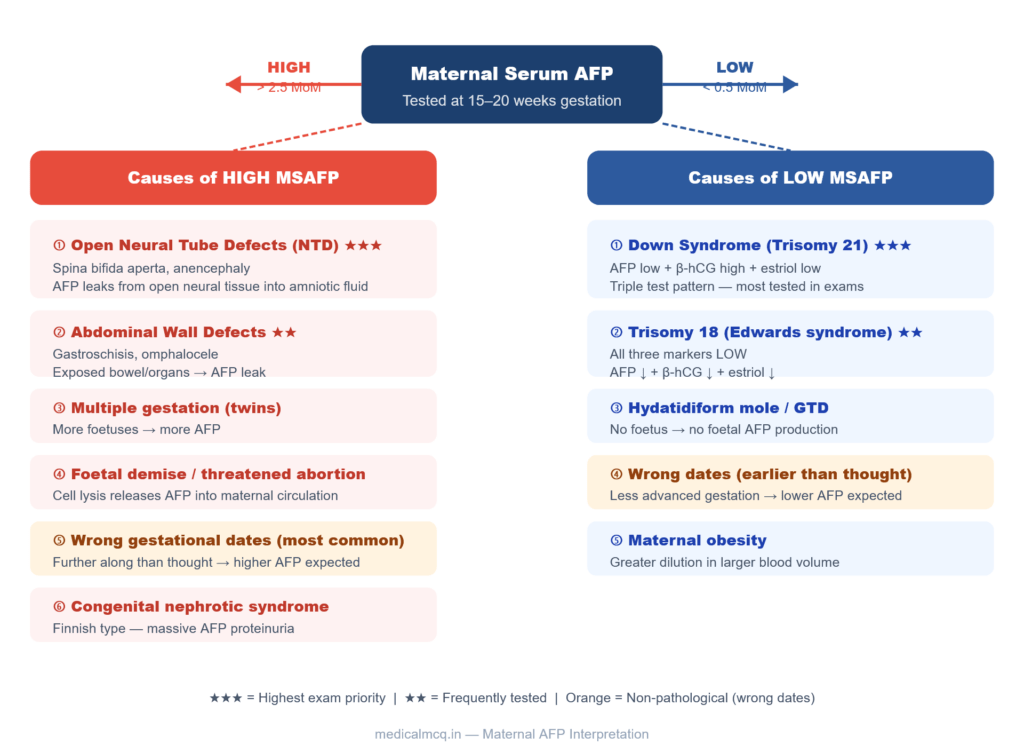 - Distinguish between causes of high vs low maternal AFP and link each to a specific diagnosis