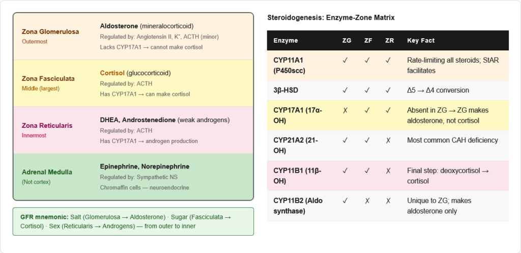 “GFR from outside in β Salt, Sugar, Sex” β Adrenal cortex zones and their products (outside β inside) G = Glomerulosa β Salt (Aldosterone β mineralocorticoid) F = Fasciculata β Sugar (Cortisol β glucocorticoid) R = Reticularis β Sex (Androgens β DHEA, androstenedione) π‘ Pro tip: Zone = Function = Hormone = “Salt-Sugar-Sex from outside in”