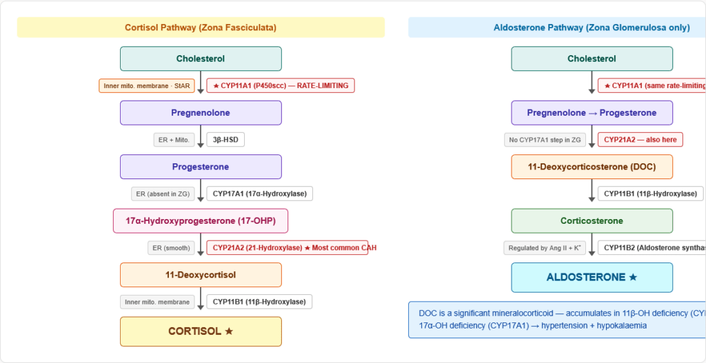 Exam tip: “Rate-limiting enzyme of steroid synthesis” = P450scc/CYP11A1. “Acute regulator of cortisol output” = StAR protein. Both are direct exam targets. ACTH stimulates both StAR and CYP11A1 β this dual action allows both acute and sustained increases in steroidogenesis. </details>