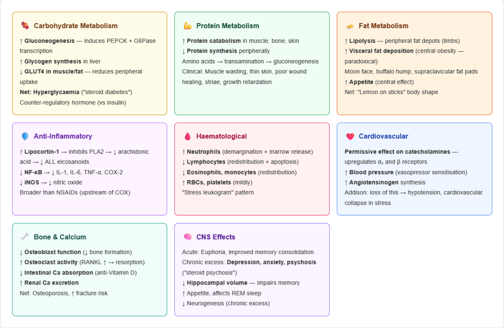 - List all the major physiological actions of cortisol across metabolism, immunity, cardiovascular, bone, and CNS