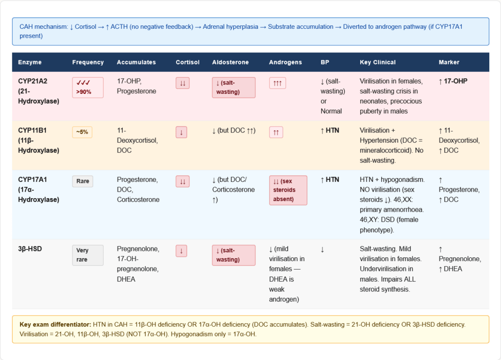 “17, 21, 11 β The Three CAH Enzymes to Know” β In order of importance/frequency in exams: 21-OH β Most common (>90%) β Virilisation Β± Salt-wasting β Elevated 17-OHP 11Ξ²-OH β 2nd most common (~5%) β Virilisation + Hypertension (DOC excess) 17Ξ±-OH β Rare β Hypertension + Hypogonadism, NO virilisation Memory: “21 is most, 11 is second, 17 is third β but 17 is the one with no sex hormones” π‘ Pro tip: “Which CAH has hypertension?” β 11Ξ² and 17Ξ± (both have excess DOC/corticosterone) β NOT 21-hydroxylase deficiency.