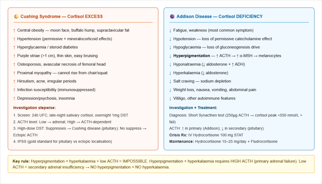 “COLDER” β Features of Addison Disease C = Cortisol deficiency (hypoglycaemia, weakness) O = Other autoimmune (vitiligo, APS) L = Loss of aldosterone (hyponatraemia, hyperkalaemia, hypotension) D = Darkness (hyperpigmentation β elevated ACTH/Ξ±-MSH) E = Electrolytes abnormal (Naβ, Kβ) R = Really needs hydrocortisone (replacement therapy) π‘ Pro tip: The key distinguishing feature of Addison disease vs secondary adrenal insufficiency is “DARK” (hyperpigmentation) + hyperkalaemia β both require β ACTH which only occurs in primary disease.