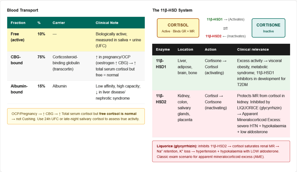 π΄ 11Ξ²-HSD2 in kidney converts cortisol β cortisone, protecting MR from cortisol Inhibited by liquorice (glycyrrhizin) β apparent mineralocorticoid excess (AME) β severe hypertension + hypokalaemia. This is one of the most classically tested enzyme facts about cortisol metabolism.