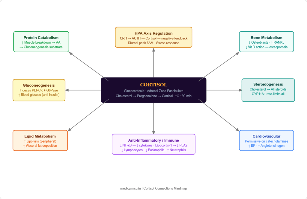 Cortisol appears in virtually every major entrance exam, and it does so across disciplines. In biochemistry, the steroidogenesis pathway and enzyme deficiencies are direct recall targets. In physiology, the HPA axis regulation, diurnal variation, and stress response are core. In endocrinology, Cushing syndrome, Addison disease, and congenital adrenal hyperplasia (CAH) are among the highest-yield clinical conditions. In pharmacology, the synthetic glucocorticoids β prednisolone, dexamethasone, hydrocortisone β are tested for their relative potencies, durations, and side effects.