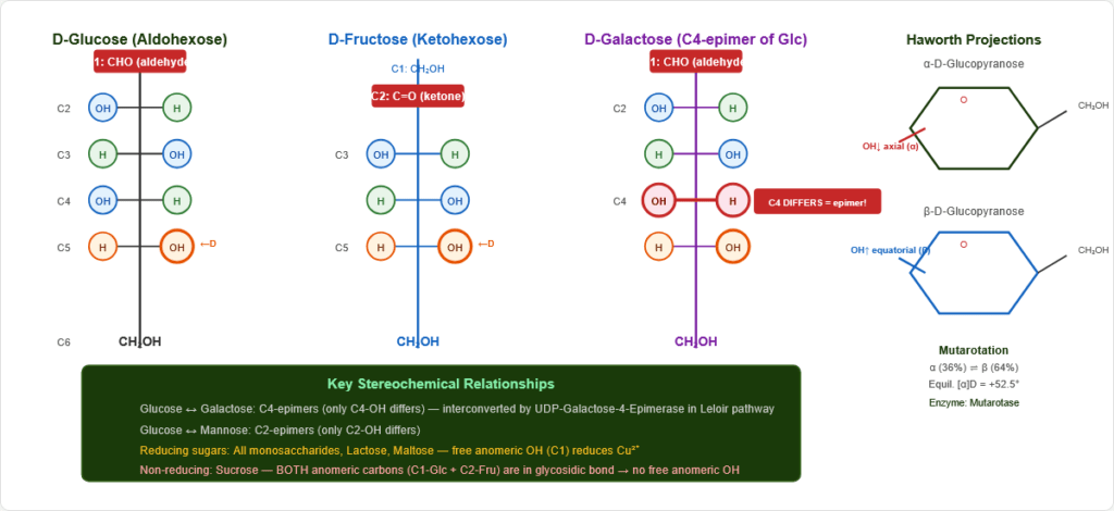 - Glucose ↔ Galactose: C4 epimers
