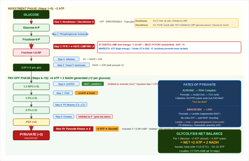 Figure 4: Complete glycolysis pathway. Investment phase (steps 1–5): 2 ATP consumed. Pay-off phase (steps 6–10): 4 ATP + 2 NADH generated. Net: +2 ATP +2 NADH per glucose. Three irreversible steps: Hexokinase (step 1), PFK-1 (step 3), Pyruvate Kinase (step 10).