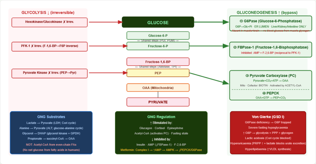❌ “All glycolytic enzymes are reversed in gluconeogenesis” ✅ Only 7 of 10 shared. Three irreversible steps need 4 unique bypass enzymes (PC, PEPCK, FBPase-1, G6Pase).