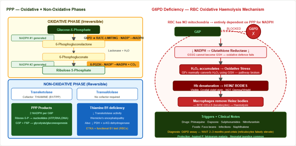 → Antioxidant Defence: NADPH from PPP → glutathione reductase → GSH regeneration. G6PD deficiency breaks this chain → oxidative haemolysis. Liver NADPH also powers cytochrome P450 monooxygenases.