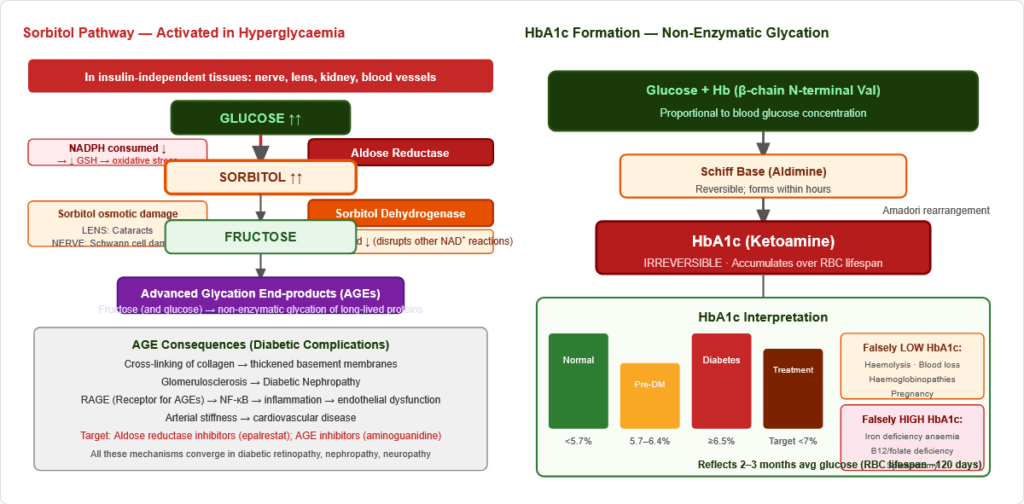 🟡 Sorbitol pathway: Aldose reductase (NADPH) → sorbitol → sorbitol dehydrogenase (NAD⁺) → fructose Activated in hyperglycaemia in insulin-independent tissues. Cataracts, neuropathy, retinopathy. Target: aldose reductase inhibitors (epalrestat).