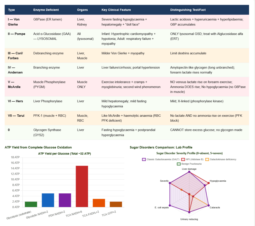 | I — Von Gierke | G6Pase (ER lumen) | Liver, Kidney | Severe fasting hypoglycaemia + hepatomegaly + “doll-face” + lactic acidosis + hyperuricaemia + hyperlipidaemia | G6P accumulates; no free glucose release |