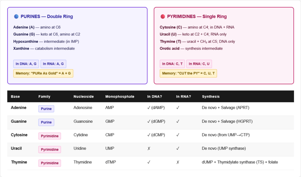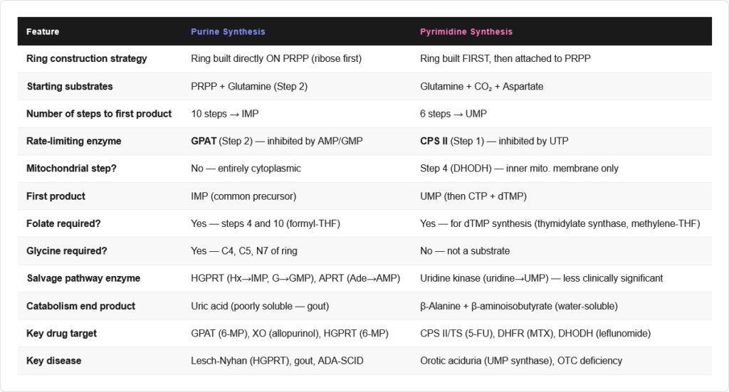 🔴 Purines: built on ribose (ring assembled on sugar). Pyrimidines: ring built first, then attached to ribose (PRPP) This structural difference in synthesis strategy is a direct exam question type.