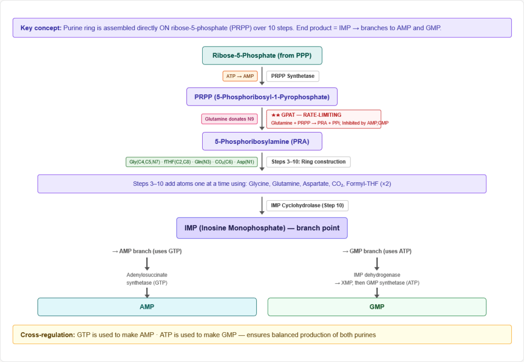 🔬 Section 2 — De Novo Purine Synthesis: Building the Ring Atom by Atom