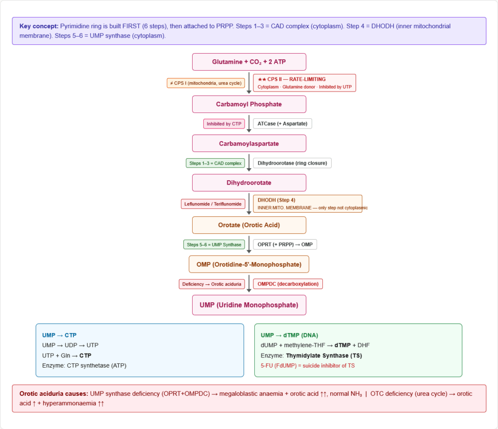 🟡 CPS I (mitochondrial, NH₃, urea cycle) vs CPS II (cytoplasmic, glutamine, pyrimidine synthesis) — NOT the same enzyme One of the most tested distinctions in nucleotide biochemistry. Ornithine transcarbamylase (OTC) deficiency causes orotic aciduria too — but via carbamoyl phosphate overflow into pyrimidine pathway (not UMP synthase deficiency).
