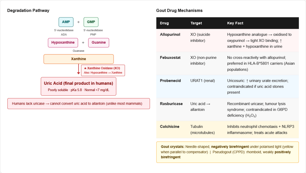 🟡 Urate-lowering drugs: Allopurinol/Febuxostat (↓production) vs Probenecid (↑excretion) Probenecid is contraindicated in patients with renal stones (increases urinary urate → more stones). Rasburicase converts urate to allantoin — used in tumour lysis syndrome but contraindicated in G6PD deficiency.
