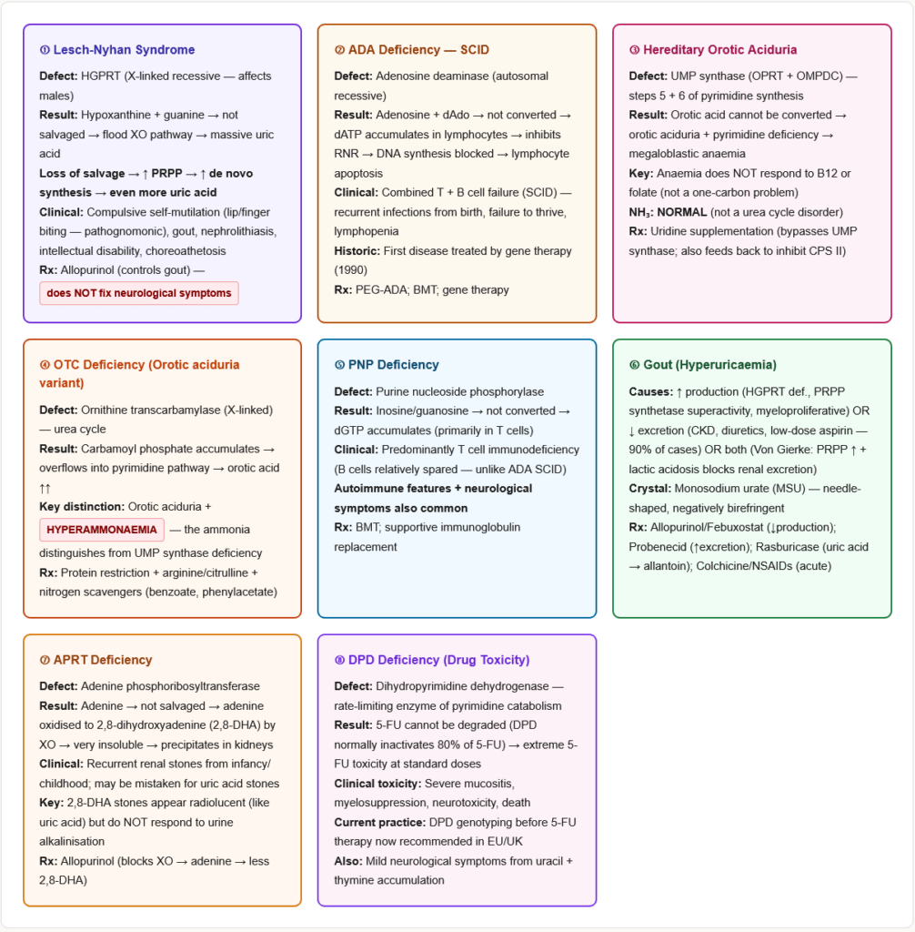 Exam tip: Orotic aciduria + megaloblastic anaemia + does NOT respond to B12 or folate = UMP synthase deficiency = hereditary orotic aciduria = treat with URIDINE. If orotic aciduria + hyperammonaemia = OTC deficiency (urea cycle) = treat with protein restriction + arginine/citrulline + nitrogen scavengers.