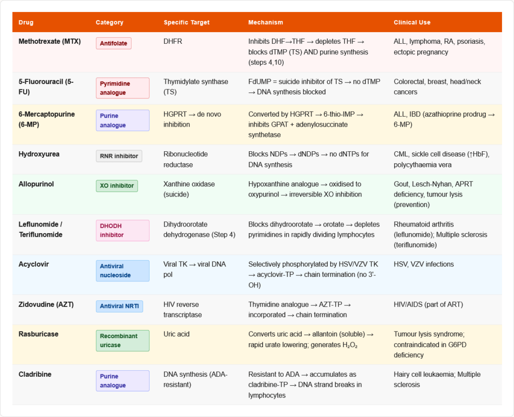 🟠 Methotrexate inhibits DHFR → depletes active folate (THF) → blocks both dTMP and purine synthesis simultaneously Leucovorin (folinic acid — reduced folate) is the antidote/rescue agent — bypasses DHFR block.