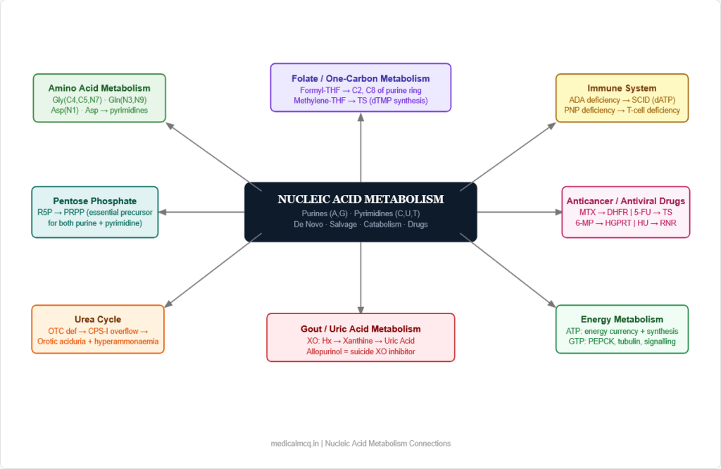Nucleic acid metabolism is tested intensively across NEET PG, USMLE Step 1, and AIIMS. Questions range from pure recall (“what is the rate-limiting enzyme of purine synthesis?”) to drug mechanism questions (“why does methotrexate cause megaloblastic anaemia?”) to full clinical scenarios (“a child with recurrent infections and lymphopenia — which enzyme is deficient?”). The pharmacology of nucleotide metabolism — anticancer drugs, antivirals, gout medications — is among the most clinically relevant biochemistry in the entire curriculum.