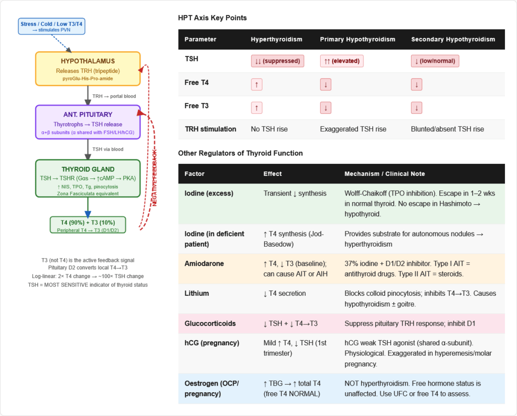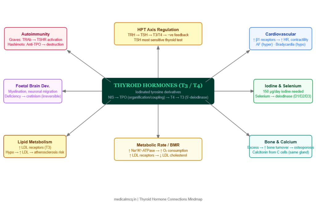 Thyroid hormones are tested across virtually every discipline in NEET PG and USMLE Step 1. In biochemistry: the synthesis pathway, iodine metabolism, and enzyme defects. In physiology: the HPT axis, negative feedback, and the wide-ranging metabolic effects. In endocrinology: the full clinical picture of Graves, Hashimoto, thyroid storm, myxoedema coma, and congenital hypothyroidism. In pharmacology: PTU, methimazole, radioactive iodine, amiodarone, and lithium. In pathology: the autoimmune basis of Graves and Hashimoto, and thyroid cancer classification.