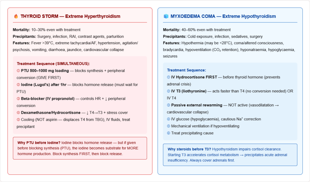 π‘ In myxoedema coma, give corticosteroids BEFORE thyroid hormone Hypothyroidism often coexists with relative adrenal insufficiency. Starting T3/T4 before steroid cover can precipitate adrenal crisis by increasing cortisol metabolism.