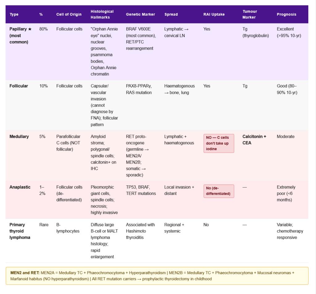 π‘ Papillary thyroid cancer: most common thyroid cancer (80%); “Orphan Annie eye” nuclei; psammoma bodies; BRAF V600E Spread is lymphatic (cervical lymph nodes). Haematogenous spread (bone, lung) is more typical of follicular carcinoma.